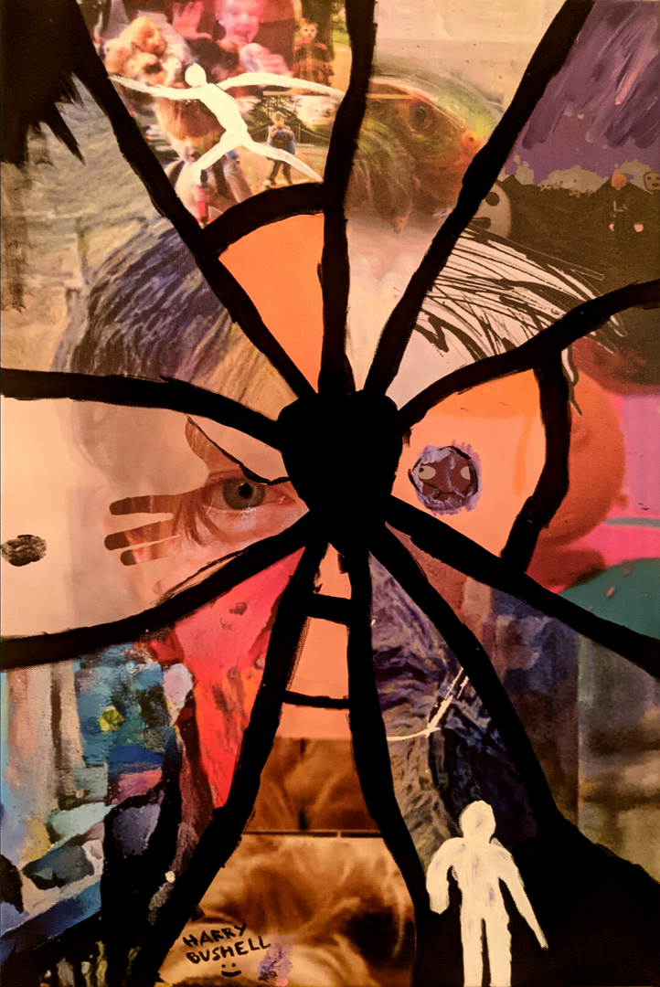 Segments were created using real life photography, scanned painting and drawing, Photoshop, and Canva. The image was then printed on canvas and altered with Sharpies, pencils, cheap acrylics and the not-so-cheap but oh-so-beautiful BLACK 3.0 from CultureHustle. I incorporated screenshots from my games, childhood photographs run through distorting filters, & a selfie run through DeepDream tech (a machine learning technology that paved the way for many now-popular forms of generative AI - for better or for worse).